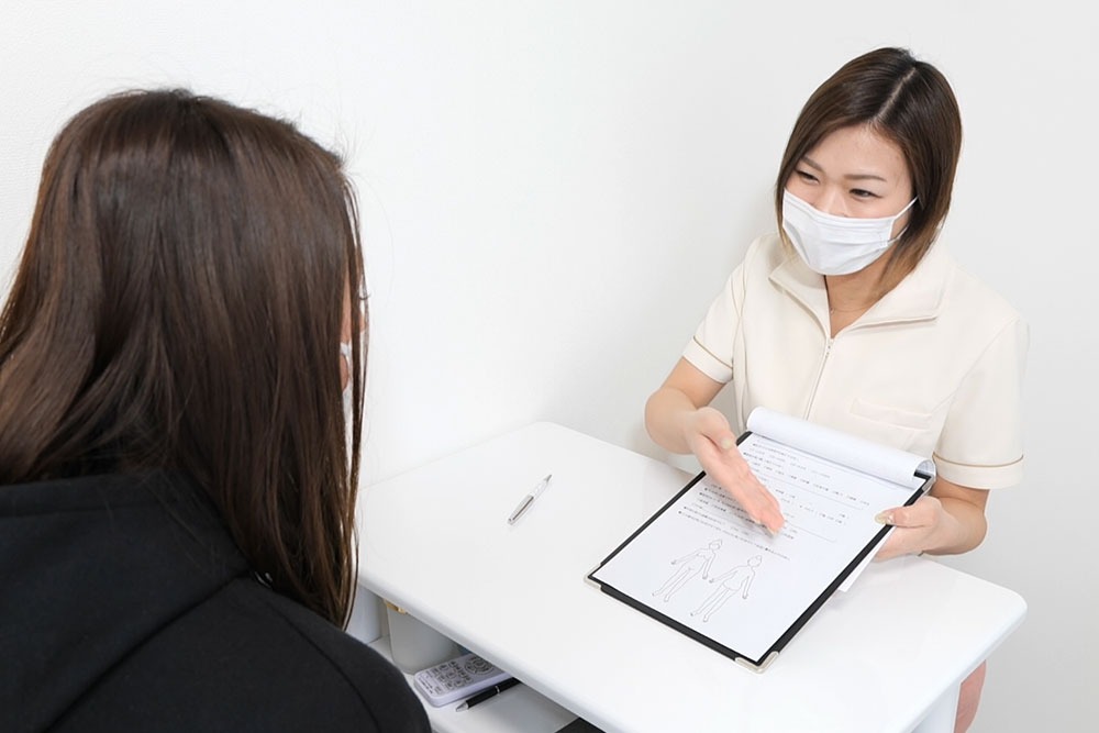 ご予約日当日、ご来店いただきましたらどの部分が痩せたいか、お悩みや理想のカラダをカウンセリングさせていただきます。